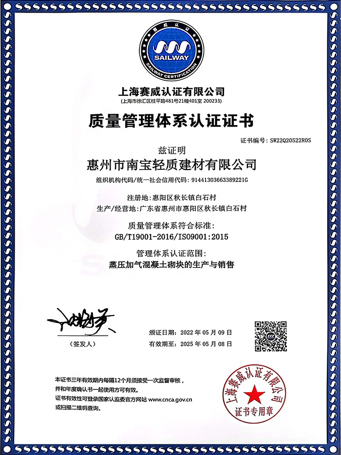 廣東省惠州市南寶輕質建材有限公司成立于2007年,公司一直致力于新型環(huán)保的墻體材料的開發(fā)、生產(chǎn)和銷售服務,生產(chǎn)的蒸壓加氣混凝土砌塊遍布惠州、深圳及周邊城市,以高品質、高性價比的產(chǎn)品和優(yōu)良的服務質量榮獲良好的行業(yè)口碑,公司于2020年再接再勵,投入3000余萬資金引進行業(yè)領先的6米全自動加氣混凝土砌塊生產(chǎn)線,具備年產(chǎn)量40萬方加氣混凝土砌塊的產(chǎn)能,同時使產(chǎn)品品質、性能更加優(yōu)越。